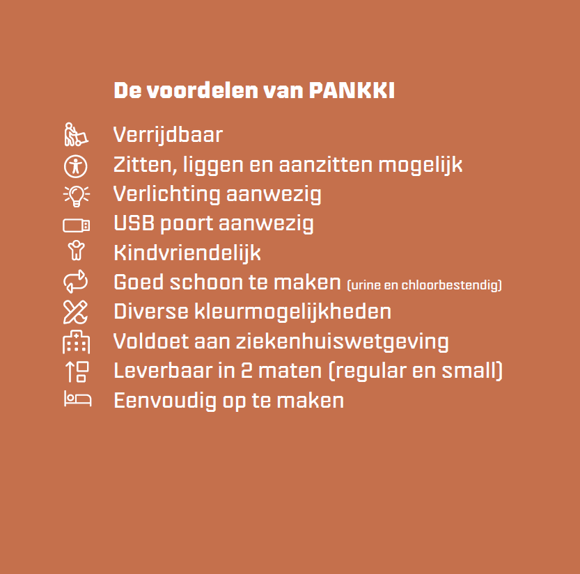 De Met PANKKI biedt u familieleden en naasten van een patiënt de mogelijkheid om dichtbij uw patiënt te zijn en te blijven overnachten. Deze zit- & slaapoplossing maakt overnachten bij een patiënt heel eenvoudig. Met PANKKI realiseert u binnen ‘no time’ een extra bed in uw zorgomgeving. De fauteuil kan met een handomdraai worden omgezet naar een comfortabele slaapplaats. PANKKI is inmiddels geplaatst bij diverse zorgorganisaties en bevordert het welzijn en het herstel van patiënten. Vrijwel iedere patiënt is namelijk gebaat bij de aanwezigheid van zijn of haar geliefde(n). De ervaring leert inmiddels dat het in sommige gevallen ook de werkdruk van personeel verlaagt, omdat een familielid lichte zorgtaken over kan nemen.